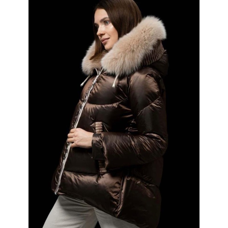 El contraste perfecto lo aporta su generosa capucha adornada con piel natural en tono claro, que enmarca el rostro con calidez y sofisticación.