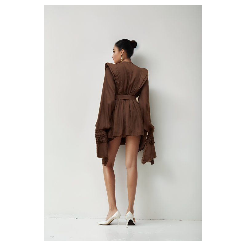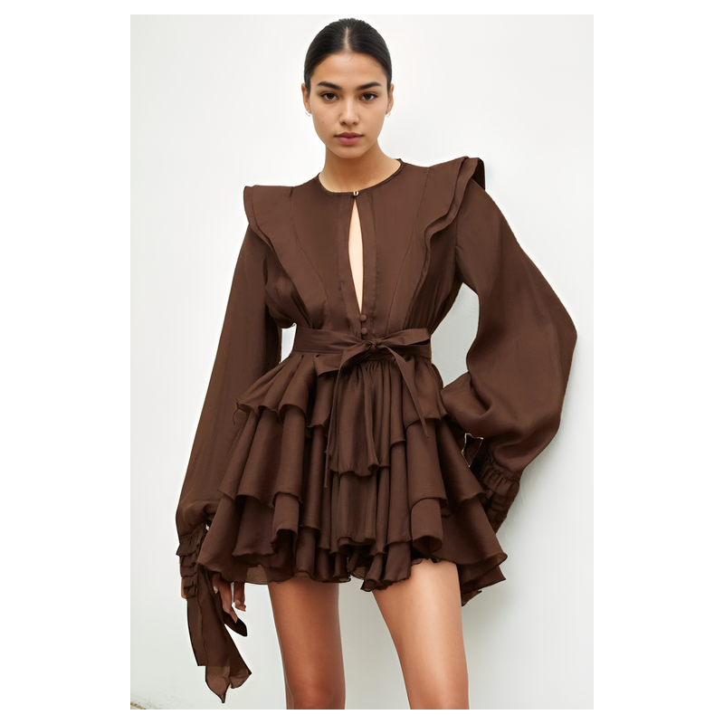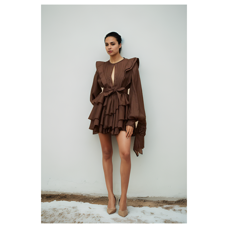 Vestido mini con volantes marrón de la colección cápsula 1.2 by Pure&Peaches.