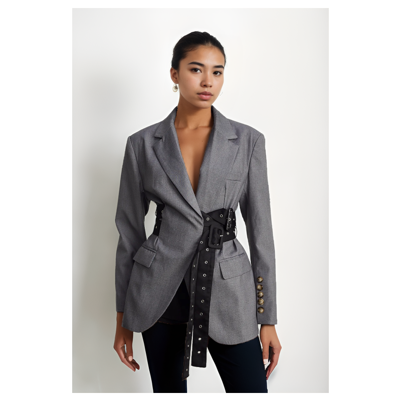Blazer gris con cintura ceñida de la colección cápsula 1.2 by Pure&Peaches.
