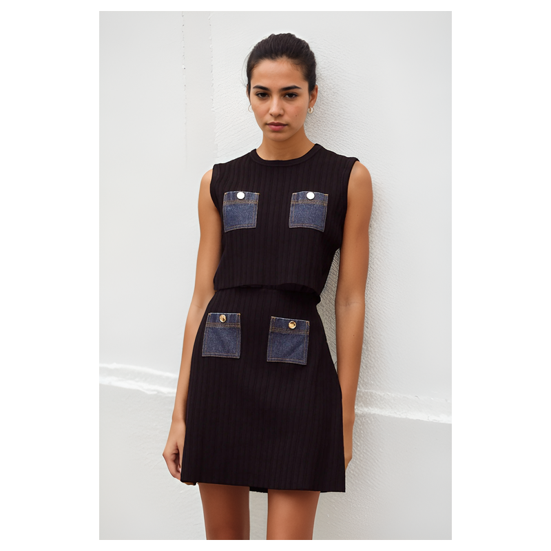 Conjunto de top + falda en punto acanalado con panel de denim azul de la colección cápsula 1.2 by Pure&Peaches.