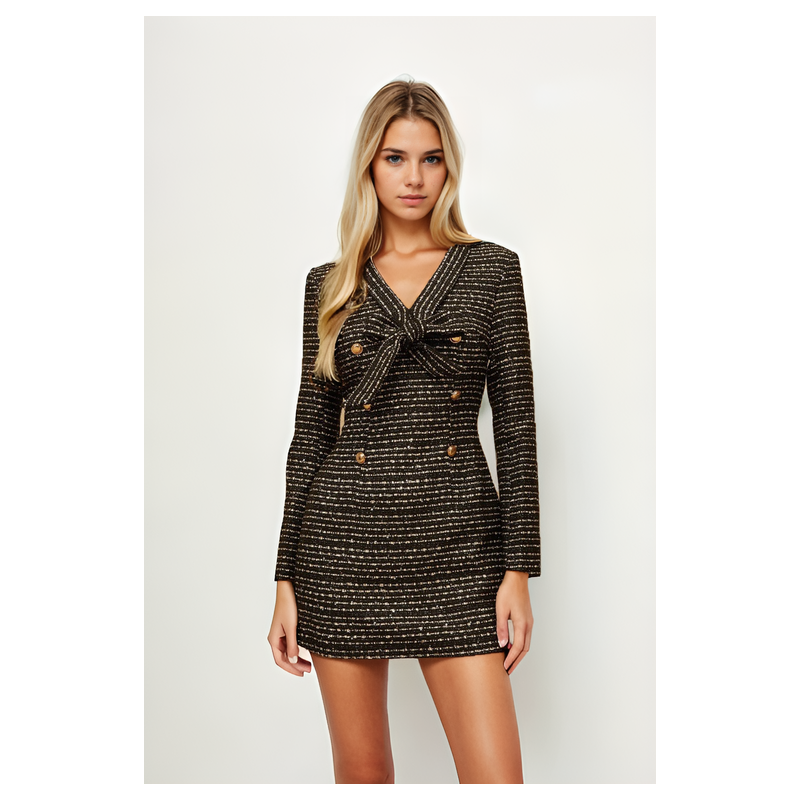 VESTIDO CORTO TWEED CON RAYAS HORIZONTALES NEGRAS