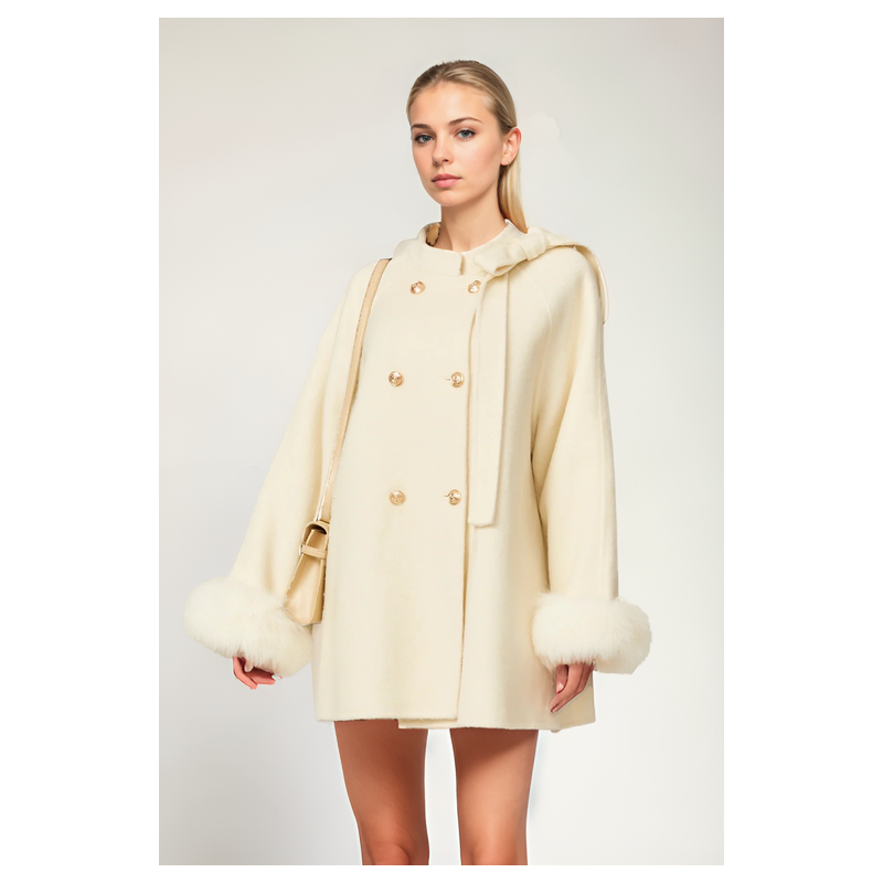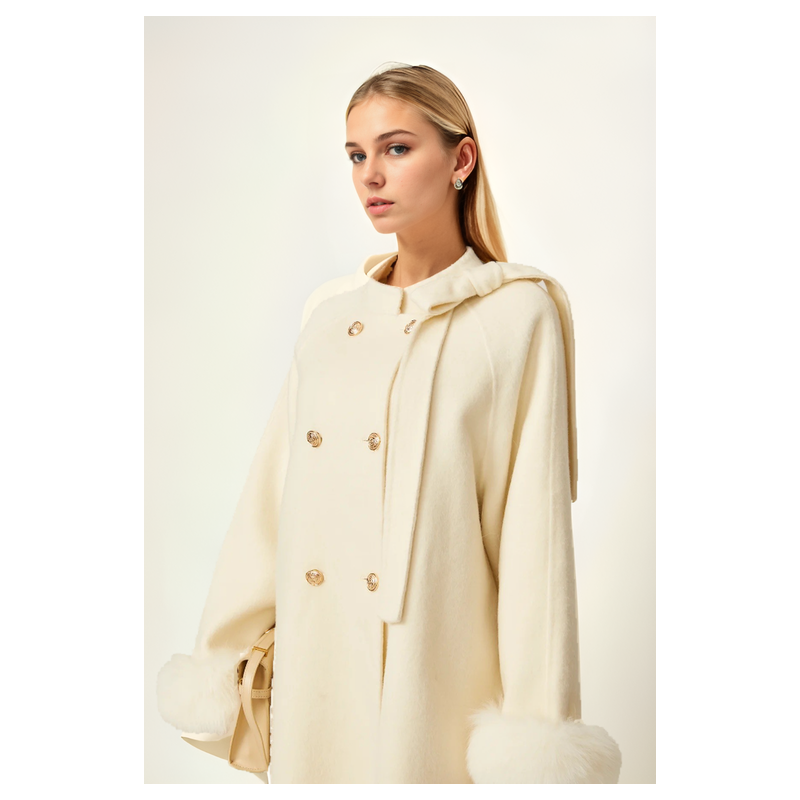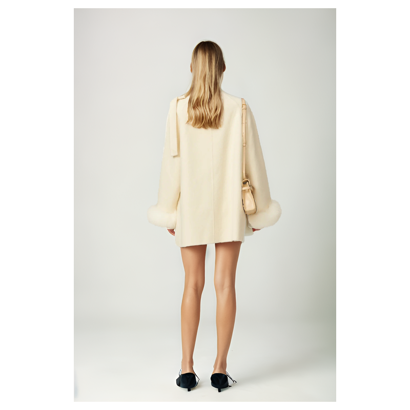 Abrigo de lana blanca con lazo de piel de la colección cápsula 1.4 by Pure&Peaches.