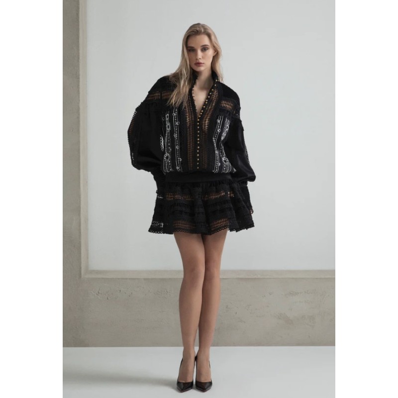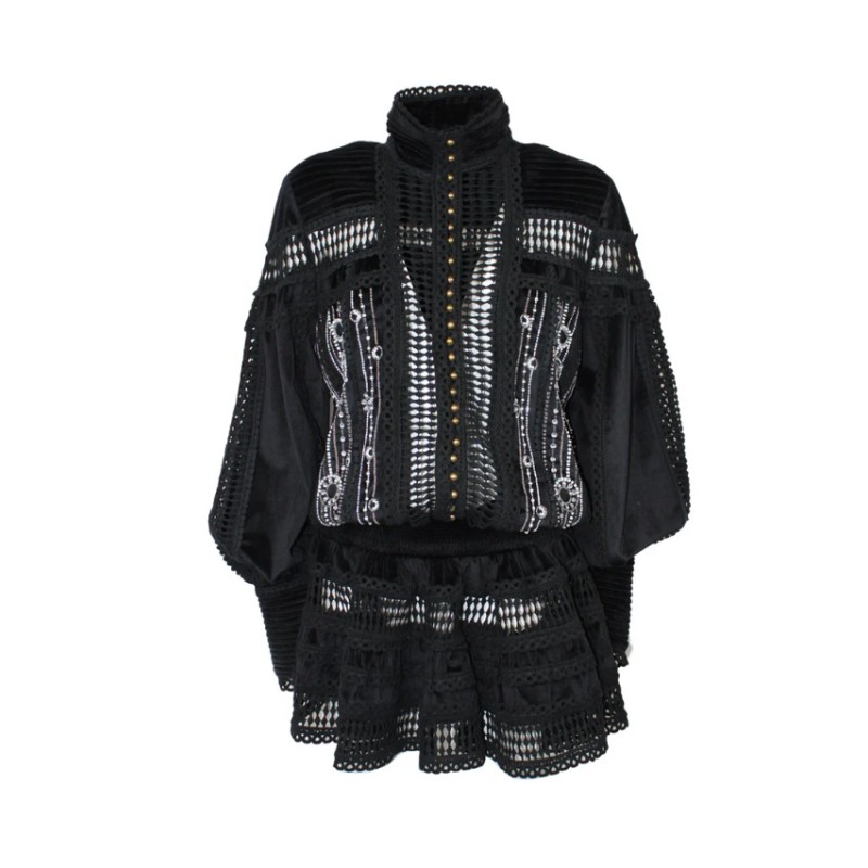 Vestido de terciopelo con falda corta fruncida con insertos de encaje y cuentas cosidas a mano.