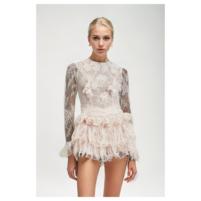 Vestido corto en capas de encaje floral blanco de la colección cápsula 1.5 by Pure&Peaches.