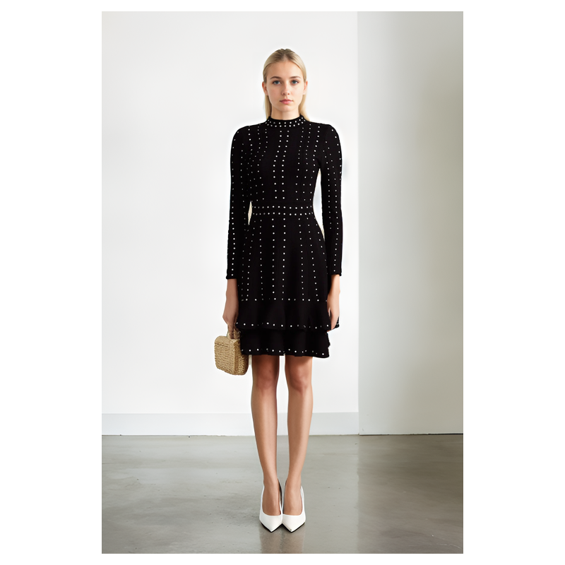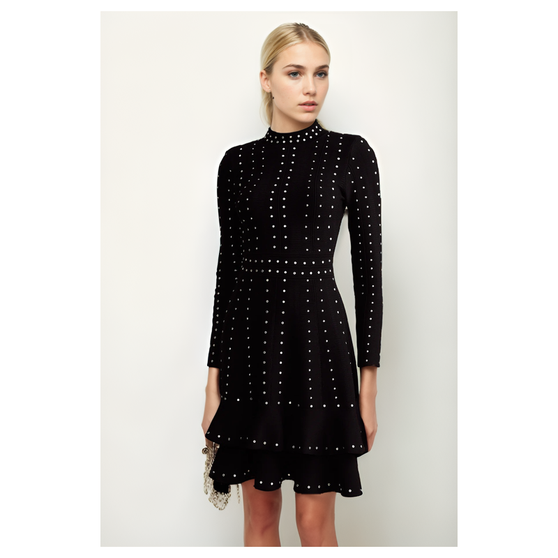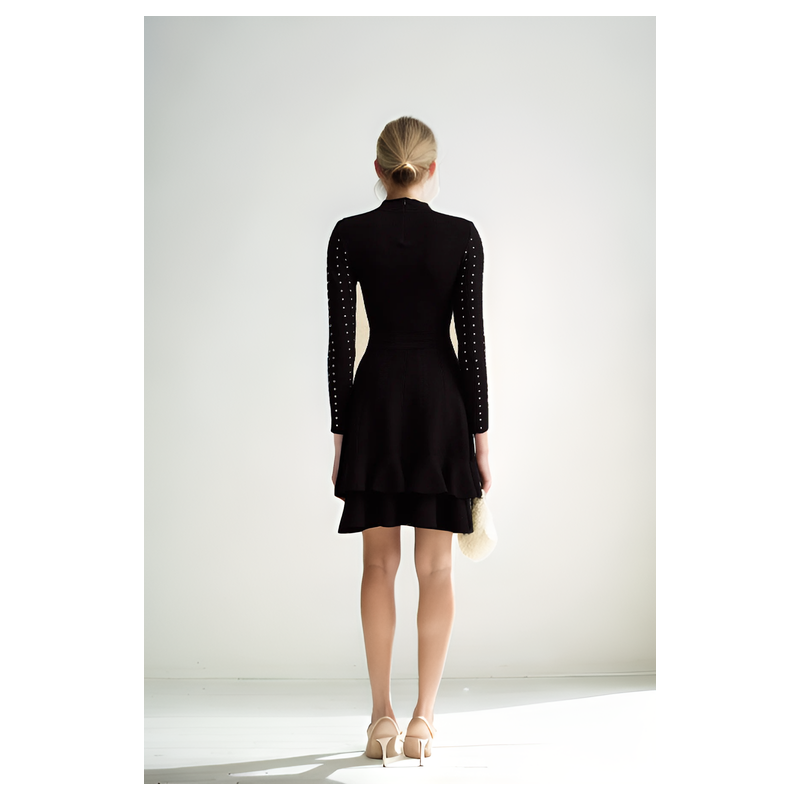 VESTIDO MINI DE PUNTO NEGRO CON VOLANTES Y DETALLES