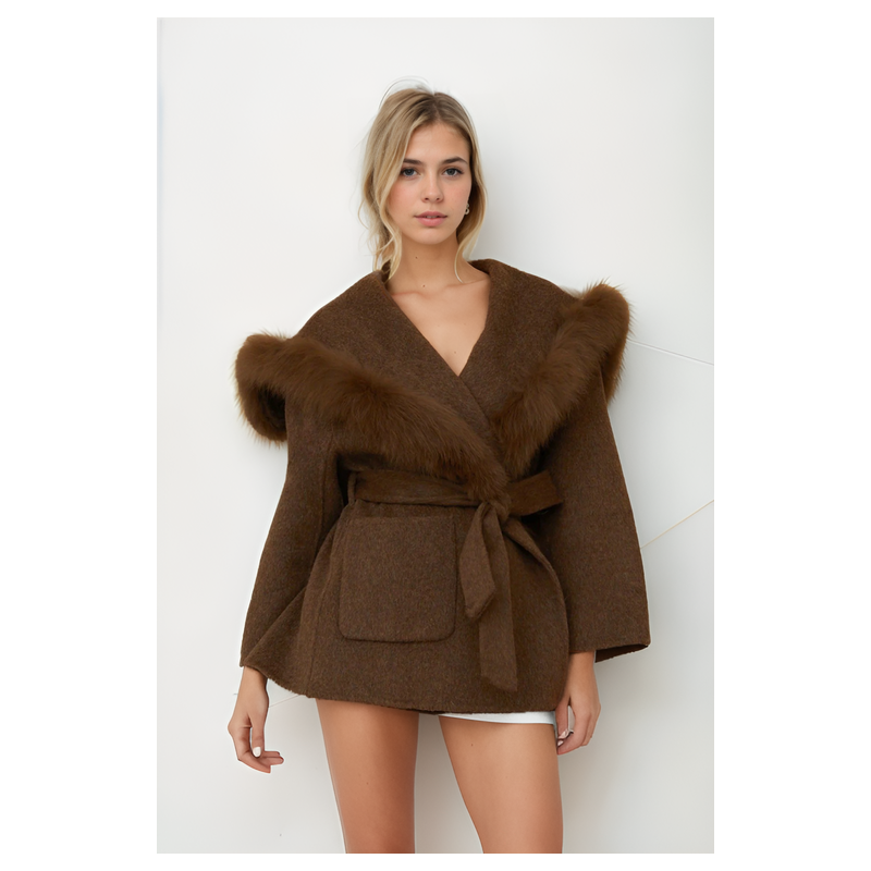Abrigo marrón de lana con ribete de piel de la colección cápsula 1.5 by Pure&Peaches.