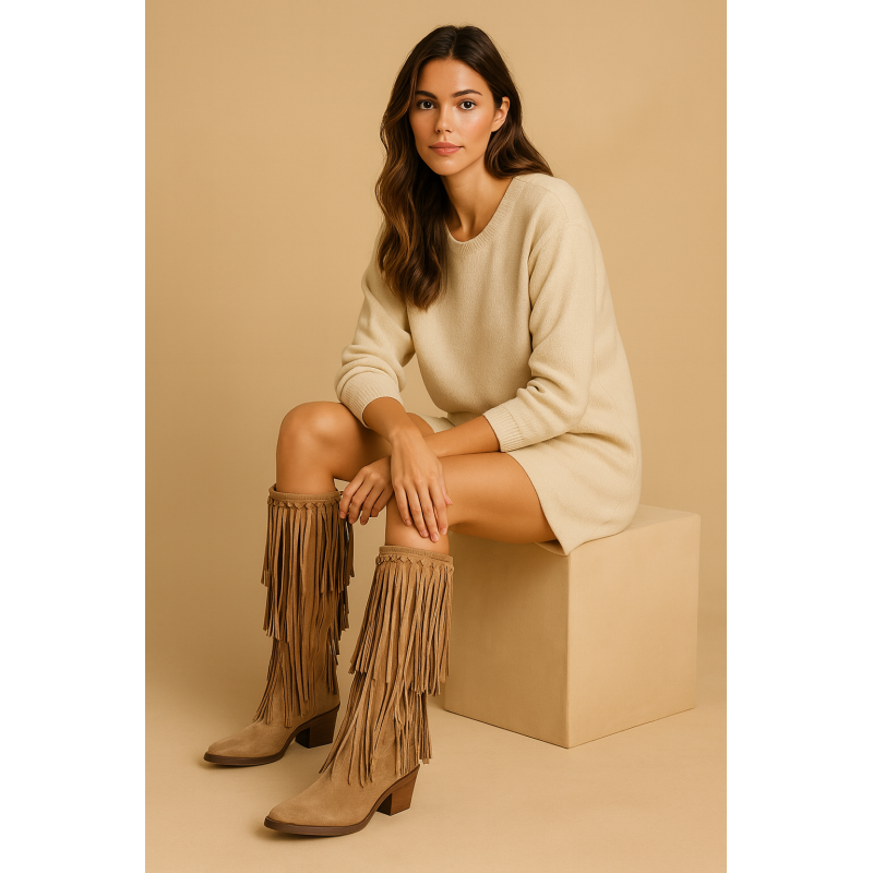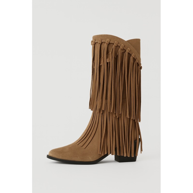 Bota con flecos en color marrón, diseñada con caña media que llega justo a mitad de la pierna, logrando un estilo equilibrado y favorecedor sin ser demasiado alta ni corta.
